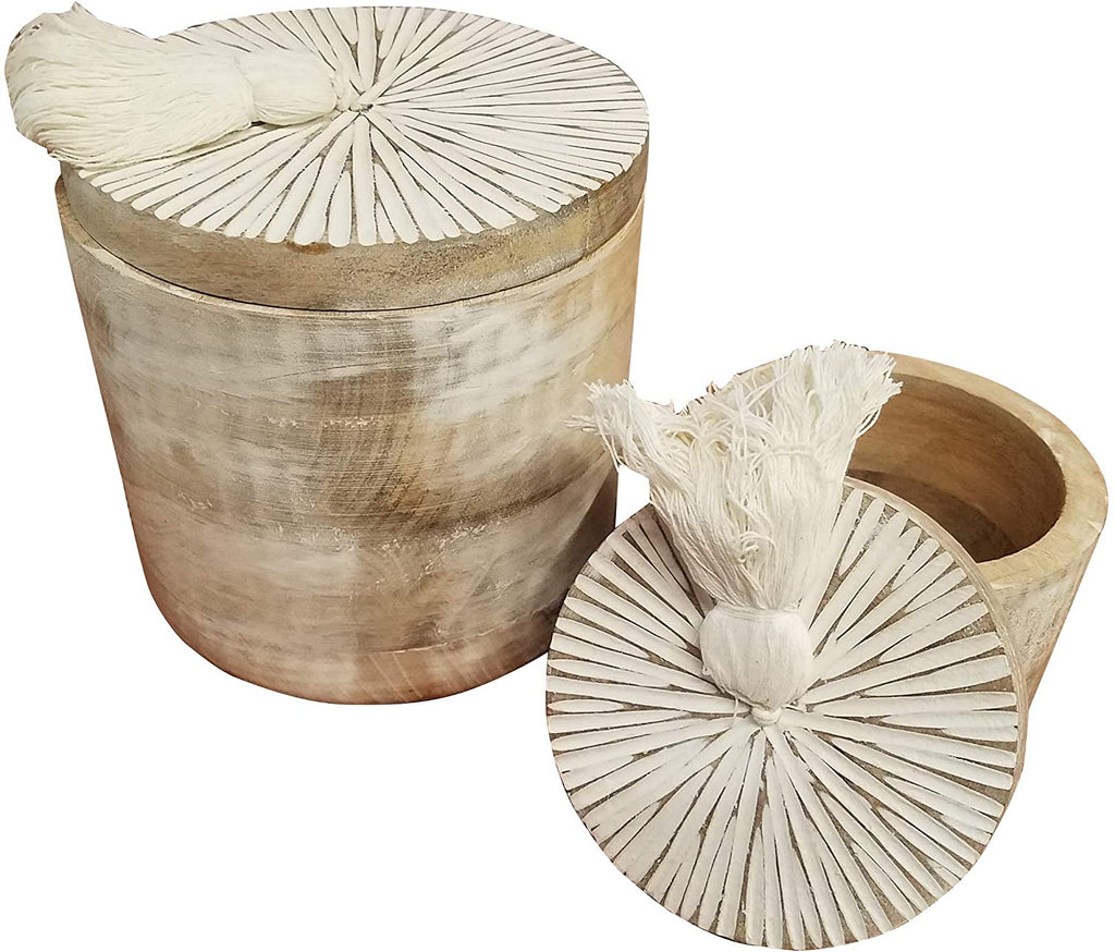 Boho Rustic Set of 2 Starburst Carved Round Wood Keepsake Boxes with Lid Bath Nursery Bedrooms & Tassel