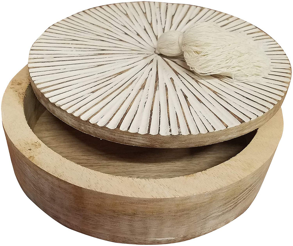 Boho Rustic Starburst Carved Round Wood Keepsake Box with Lid & Tassel Bath Nursery Bedroom