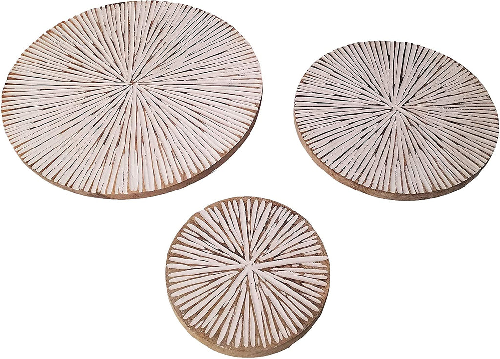 Boho Rustic Set of 3 Starburst Carved Round Wood Wall Plaques