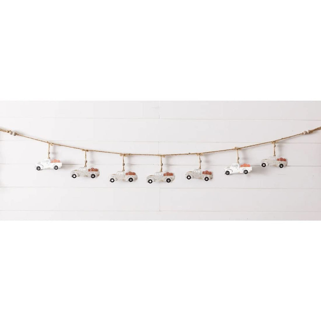 Fall garland of white metal flat hanging trucks with a load of orange pumpkins in the truck anll hanging from jute rope. The garland is 68 inches long.
