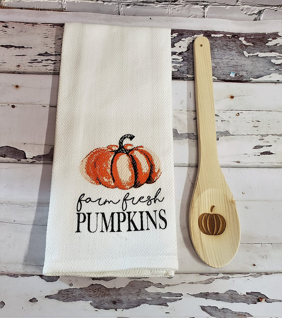 - Farm Fresh Pumpkins dish towel and wooden spoon