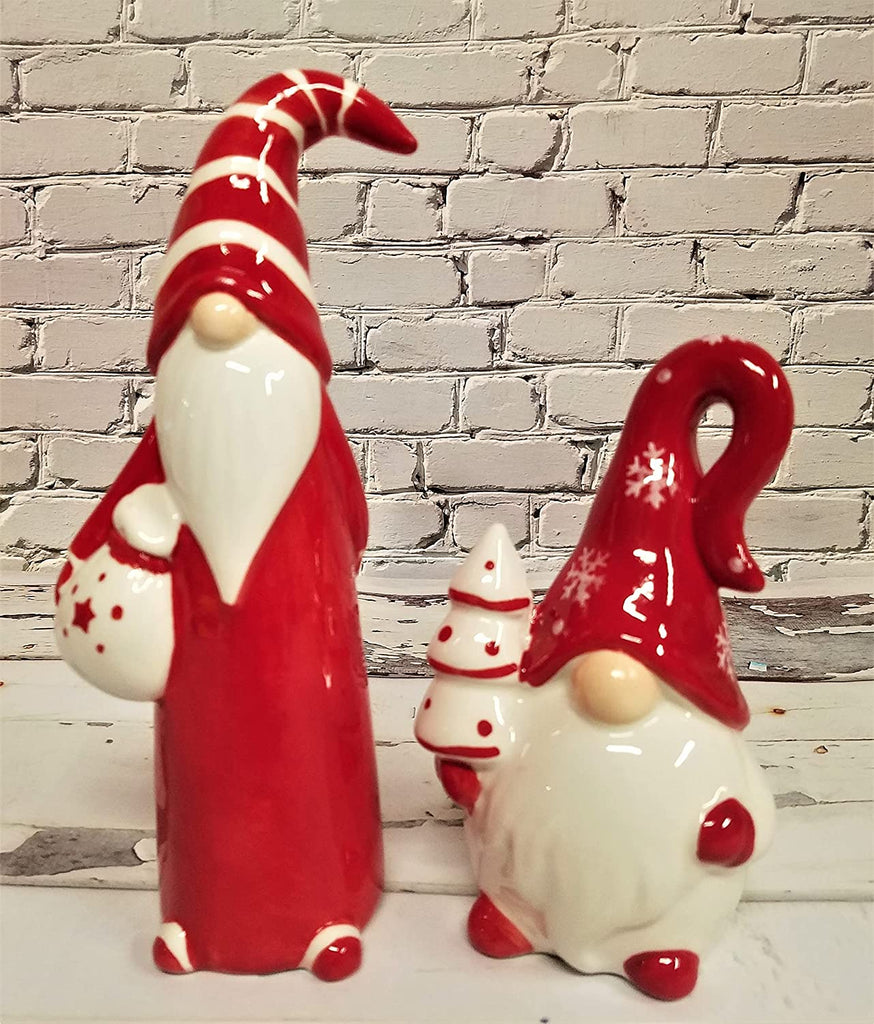 Set of 2 Christmas Gnomes each bearing gifts. You will receive the tall gnome carrying a sack of gifts and the short chubby gnome carrying a tree. Great for tabletop or shelf Christmas decor.