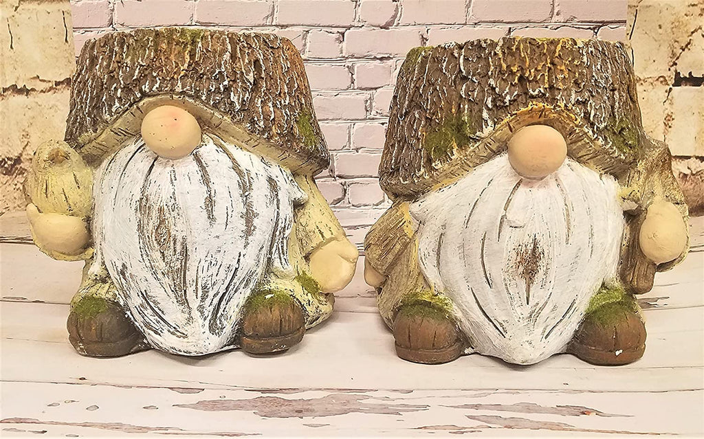 Set of 2 resin Gnome planters with a bark/log appearance and faux moss accents. Planters for use on a porch or in your garden.