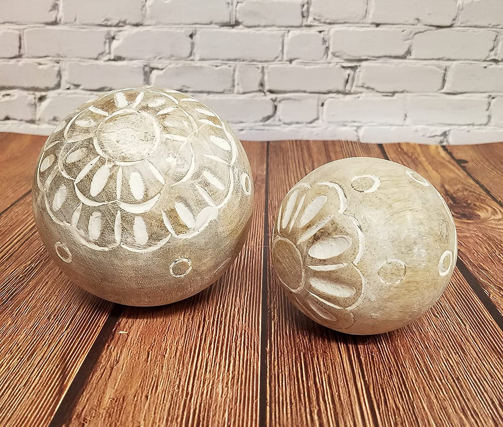 You will receive a set of 2 carved wood balls. You will receive one 4 inch ball and one 3 inch ball. Each ball has flower medallions as carved accents and whitewashed effect.
