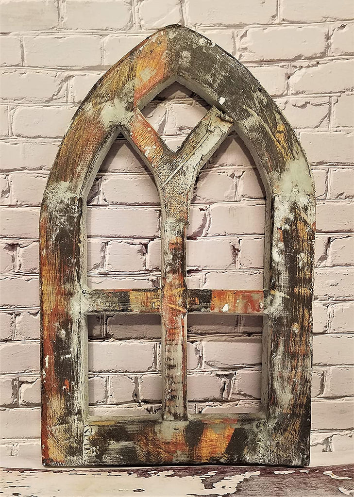 Rustic and handmade from reclaimed wood, architectural chapel wall sculptures with very deeply distressed and painted features in multi colors. Each piece is made by hand and very unique. Colors variations are part of the charm.