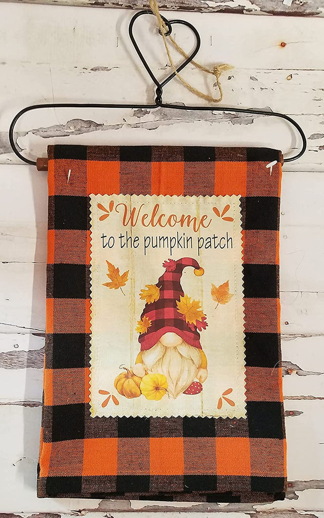 Fall and Halloween decorative kitchen dish towel on a black wire metal hanger with heart. The towel has a decorative Fall or Halloween Gnome themed patch. Beautiful fall kitchen decor.